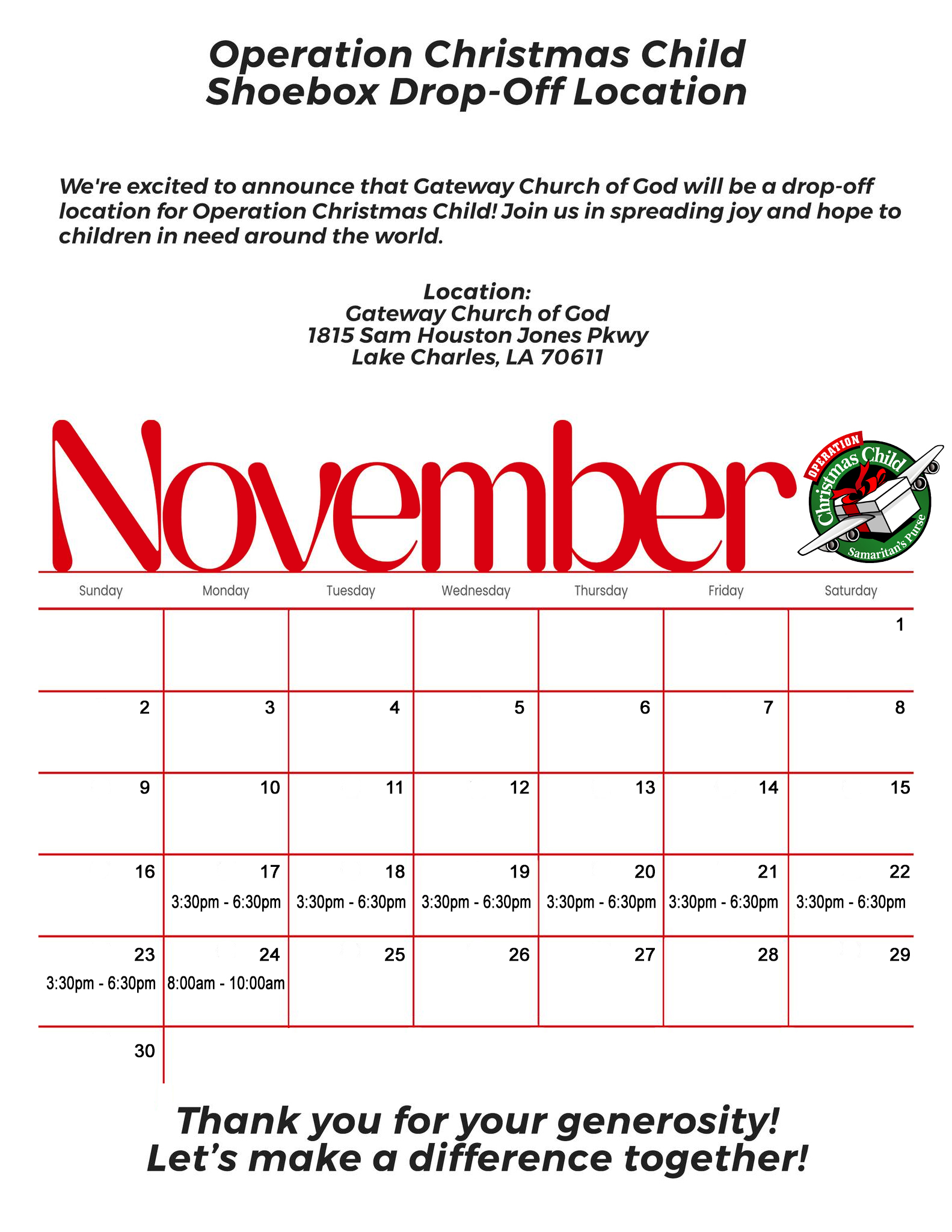 We’re thrilled to share that our church is partnering with Operation Christmas Child as a drop-off location this year. Bring your packed shoeboxes between November 17 and 24 and be part of spreading hope and the message of Christ around the world.
